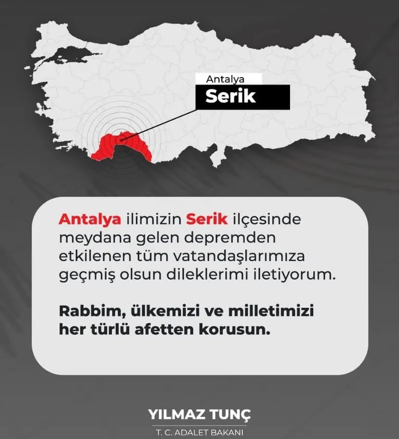 Adalet Bakanı Yılmaz Tunç, Antalya’nın Serik ilçesinde meydana gelen 4.9 şiddetindeki deprem sonrası geçmiş olsun mesajı yayımladı.
