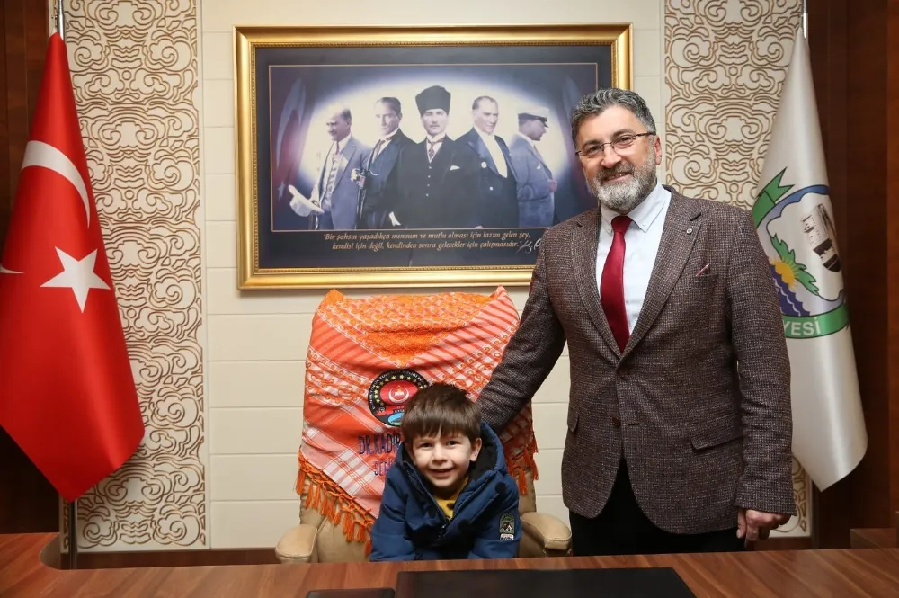Serik Belediye başkanı Op. Dr. Kadir Kumbul’u ziyaret eden ve başkanlık makamına oturan ilk okul öğrencisi Yavuz Selim’in, ilk talimatı çocuklar için oyun alanları yapılsın dedi.