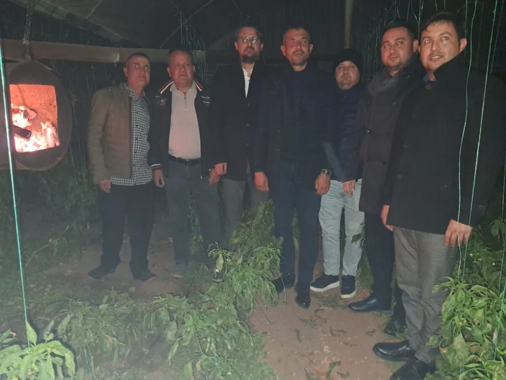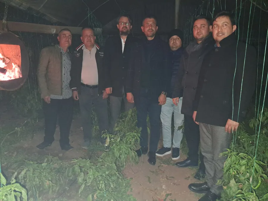 AK Parti Serik İlçe Başkanı Ahmet Söker ve beraberindeki heyet Sarıabalı Mahallesinde sera içinde Don nöbetinde bulunan üreticileri ziyaret edip, hasbihal etti.