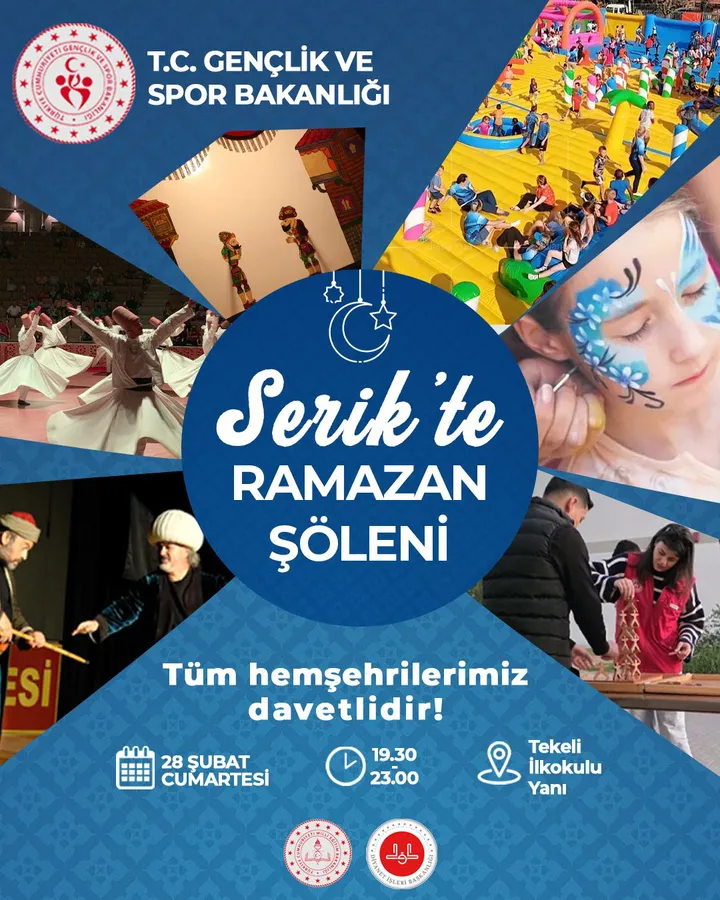 Gençlik ve Spor Bakanlığı tarafından 28 Şubat Cumartesi günü Serik ilçesi Tekeli İlkokulu bahçesinde Ramazan Şöleni etkinliği düzenlenecek.