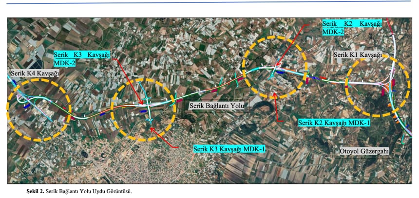 Proje kapsamında en kapsamlı yatırım ise Serik'te gerçekleştirilecek. Otoyoldan ayrılarak D400 karayoluna bağlanacak Serik Bağlantı Yolu, 11 bin 575 metre uzunluğunda olacak. Mevcut D400 karayolu da proje dahilinde 2x3 şeritli olarak revize edilecek. Proje kapsamında otoyol bağlantı noktalarında gişe alanı ve diamond tipi kavşaklar inşa edilecek. D400 karayoluna bağlanacak trompet kavşak ise mevcut tesislerin kamulaştırılmaması için batıya kaydırıldı. Serik Çevre Yolu'nun yatırım maliyeti 135 milyon 854 bin 431 TL olarak açıklandı. Valiliğin değerlendirmesi sonucunda proje de "ÇED Gerekli Değildir" statüsüne alındı.