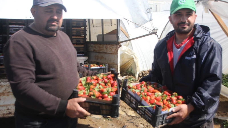 Baba oğul çilek üretiyor