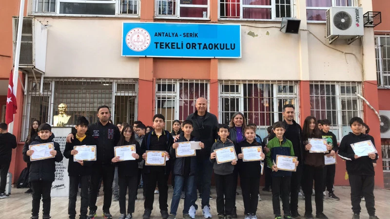 Tekeli Ortaokulunda geçen haftalarda yapılan Türkiye geneli deneme sınavında dereceye giren öğrenciler başarı belgeleri ve süpriz hediyeler ödüllendirildi. Ödülleri sınıf öğretmenleri tarafından takdim edildi. Deneme sınavında 500 tam puan alarak Türkiye birincisi olan 6F sınıfı öğrencisi Elifsu Yılmaz okulunu, ilçemizi ve ilimizi Türkiye’de temsil etmiştir. Madalyasını ve hediyesini Okul Müdürü Halil Alkan verdi.