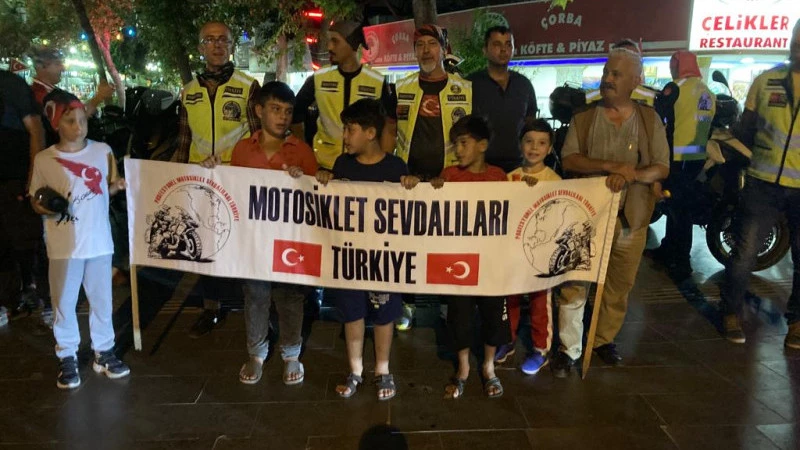 Çınaraltı meydanında toplanan motorcular saygı duruşu ve istiklal marşının okunmasının ardından konvoy düzenleyerek meşaleler eşliğinde kortej yaptı.