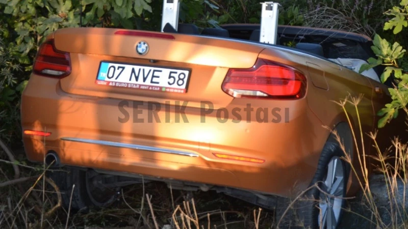 Antalya’nın Serik ilçesinde 2 Rus turist araç kiralama şirketinden kiraladıkları spor otomobil ile yol kenarında bulunan sylama kanalına devrildi.