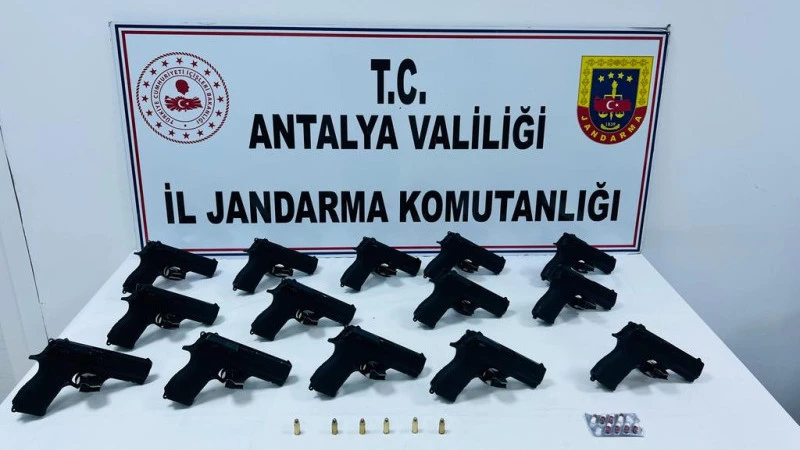 Antalya İl Jandarma Komutanlığı İstihbarat Şube Müdürlüğü ile Serik İlçe Jandarma Komutanlığı JASAT timleri, çeşitli suçlardan aranan 3 şüphelinin il dışından getirdikleri ruhsatsız tabancaları piyasaya sürecekleri bilgisinhe ulaştı. Jandarma ekipleri, Serik'te şüphelilerin kullandığı aracı durdurup arama yaptı. Aramada; 14 ruhsatsız tabanca, 15 tabanca şarjörü, 6 tabanca fişeği, 8 adet uyuşturucu sentetik hap ele geçirildi. Gözaltına alınan 3 şüpheli, jandarma karakoluna götürüldü.