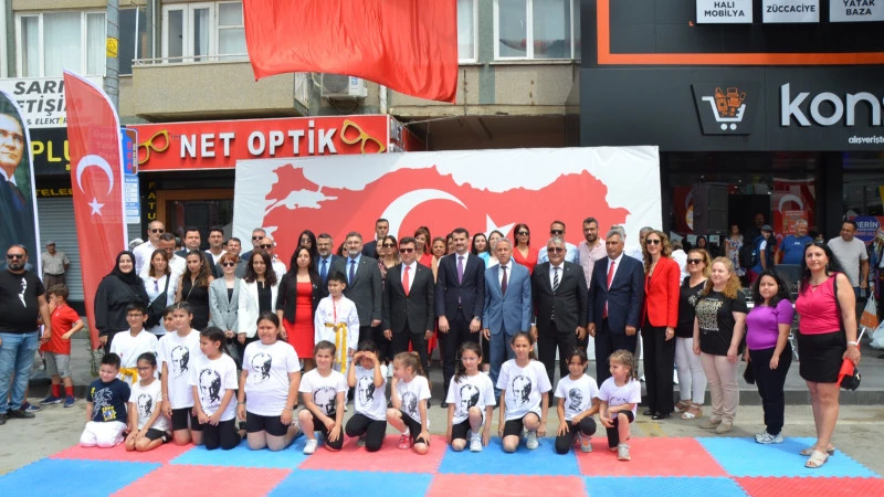 Atatürk Caddesi Cumhuriyet Meydanı'nda düzenlenen ilk törende saygı duruşunda bulunulması ve İstiklal Marşı'nın okunmasının ardından İlçe Gençlik ve Spor Müdürü Mevlüt Özen tarafından Atatürk Anıtı'na çelenk konuldu.