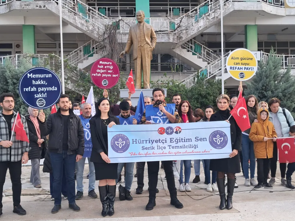 Hürriyetçi Eğitim Sen Serik Temsilciliği, memur ve memur emeklilerine ‘refah payı’ talebiyle ilgili basın açıklaması yaptı. Cumhuriyet Meydanı Serik İlçe Milli Eğitim Müdürlüğü önünde yapılan basın açıklamasına Serik Temsilcisi Hakkı Altmışdört ve Hürriyetçi Eğitim Sen Serik Temsilciliği üyeleri katıldılar.