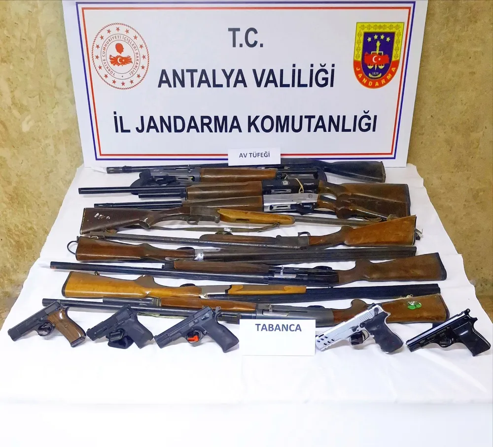 Antalya İl Jandarma Komutanlığınca yürütülen çalışmalar kapsamında, Antalya Cumhuriyet Başsavcılığı talimatları doğrultusunda; Korkuteli ilçesinde ruhsatsız silah bulundurduğu tespit edilen 5 şüpheli şahsa ait araç, ikamet ve eklentilerinde eş zamanlı yapılan aramalarda; 5 adet ruhsatsız tabanca ve şarjörleri, 10 adet ruhsatsız av tüfeği ele geçirilmiştir. Olayla ilgili şüpheli şahıslar hakkında adli ve idari işlemlere başlanıldı.