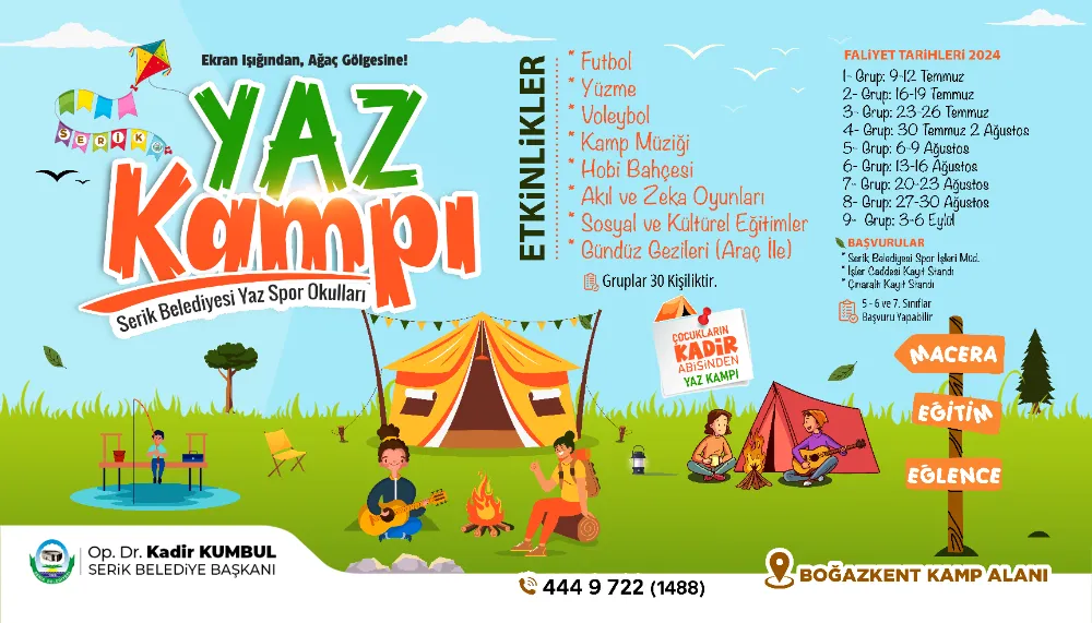 Serik Belediyesi, ilçede okuyan 5-6 ve 7. sınıf öğrencileri için yaz kampı düzenliyor. Sosyal, kültürel ve sportif aktivitelerin yer aldığı bu kamp, çocuklara unutulmaz bir deneyim sunmayı amaçlıyor.