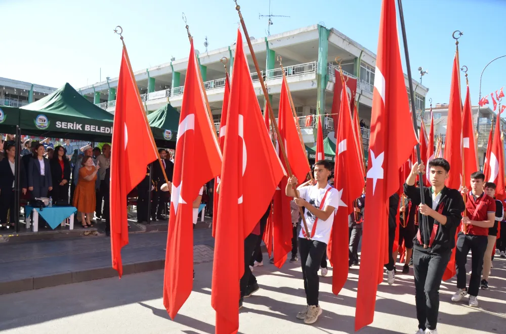 28 Ekim Pazartesi günü çelenk sunma töreni ile başlayan 29 Ekim Cumhuriyet Bayramı’nın 101. Yıldönümü kutlamaları bugün yapılan ana programla devam etti. Serik Cumhuriyet Meydanı Atatürk Caddesi’nde düzenlenen kutlamalara, Kaymakam Cemal Şahin, Serik Belediye Başkanı Op. Dr. Kadir Kumbul, Cumhuriyet Başsavcısı Muhammed Kaan Özel, daire müdürleri, siyasi partiler, sivil toplum kuruluşları, okulla, öğrenciler ve vatandaşlar katıldılar. Kaymakam Cemal Şahin ve Serik Belediye Başkanı Op. Dr. Kadir Kumbul’un vatandaşların bayramlarını kutlamaları ile başlayan program saygı duruşunda bulunulması ve İstiklal Marşı okunması ile devam etti. Günün anlam ve önemini belirten konuşmayı Kaymakam Cemal Şahin yaptı. Daha sonra öğrenciler şiirlerini ve kompozisyonların okudular. Müzik dinletisi yapıldı, şarkılar söylendi, halk oyunları gösterileri yapıldı. Ertuğrul Gazi Anadolu Lisesi tarafından hazırlanan programın sonunda öğrencileri ve kamu araçlarının resmigeçit töreni yapıldı. Serik'te 29 Ekim kutlamaları bugün akşam Serik Belediyesi tarafından düzenlenecek olan fener alyı ile devam edecek. Fener alayı Serik Hali’nde başlayarak Çınaraltı Meydanına kadar yürüyecek. DHA