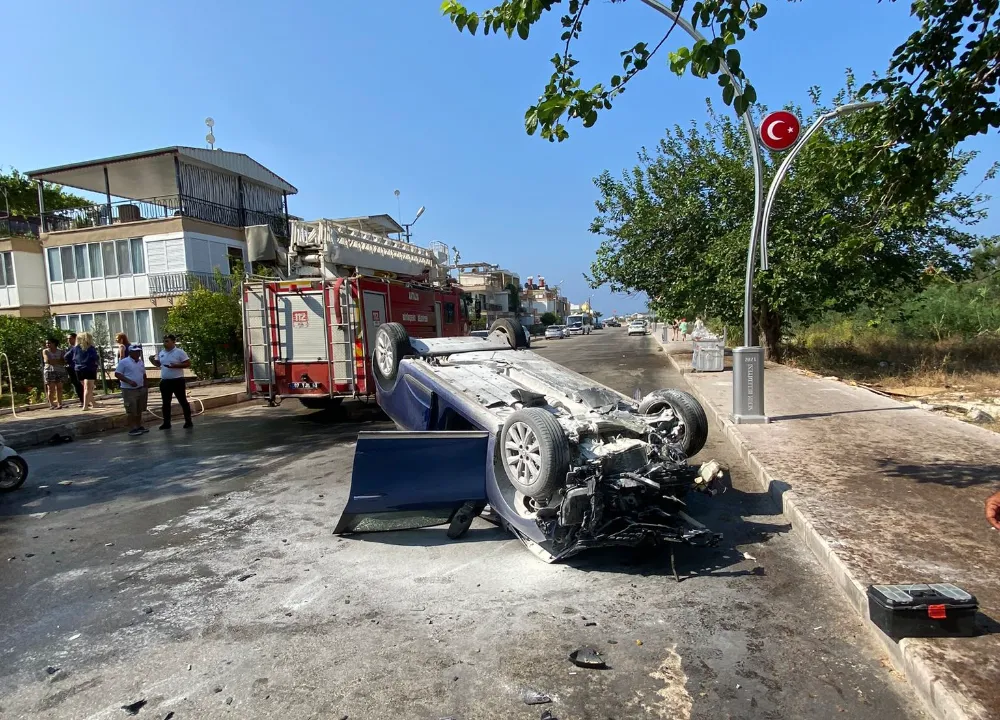 Serik’te direğe çarpan otomobil araçlara çarparak takla attı
