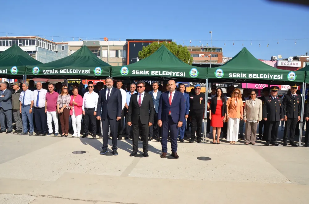 Serik Cumhuriyet Meydanı'ndaki törene, Kaymakam Dr. Cemal Şahin, Belediye Başkanı Op.Dr. Kadir Kumbul, daire müdürleri, siyasi parti ilçe temsilcileri, gaziler ve sivil toplum kuruluşları temsilcileri katıldı.